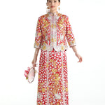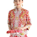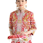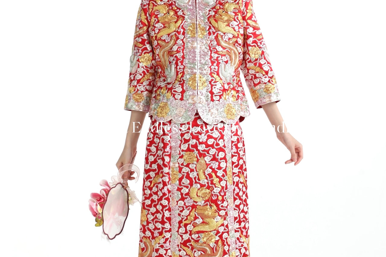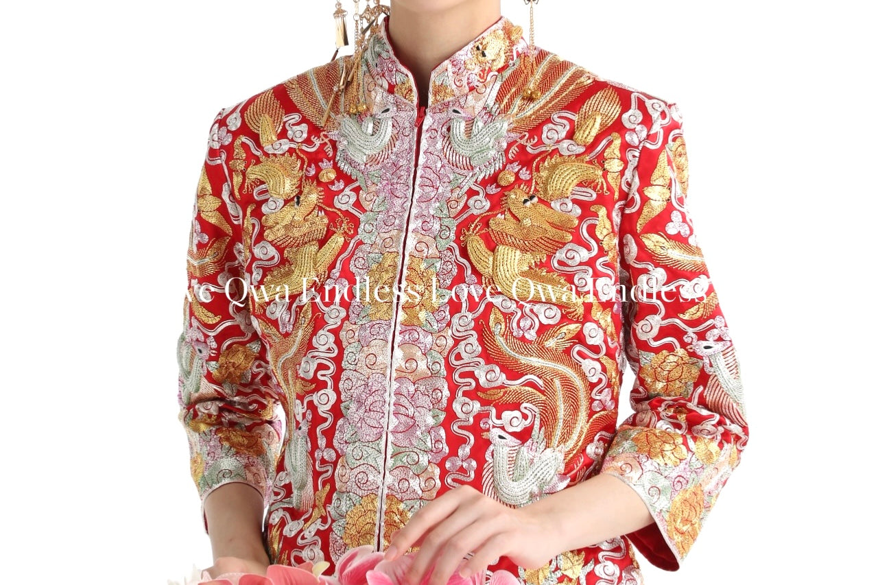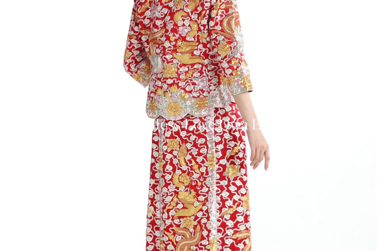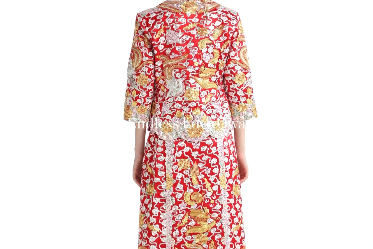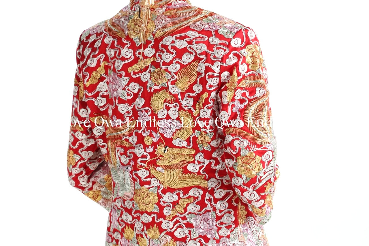 這個等級的龍鳳褂將金銀絲線和紅色的比例均衡,如果想選擇帶有中式喜慶的龍鳳褂,大五福將會是和合適的選擇。