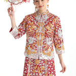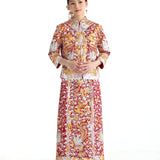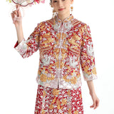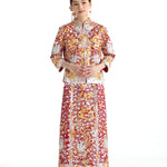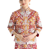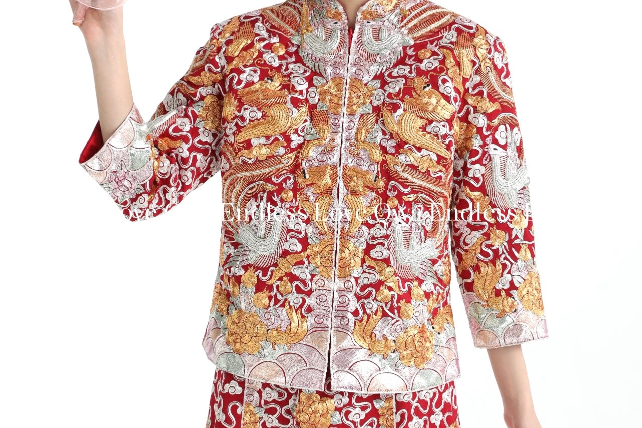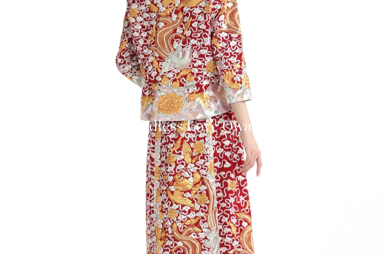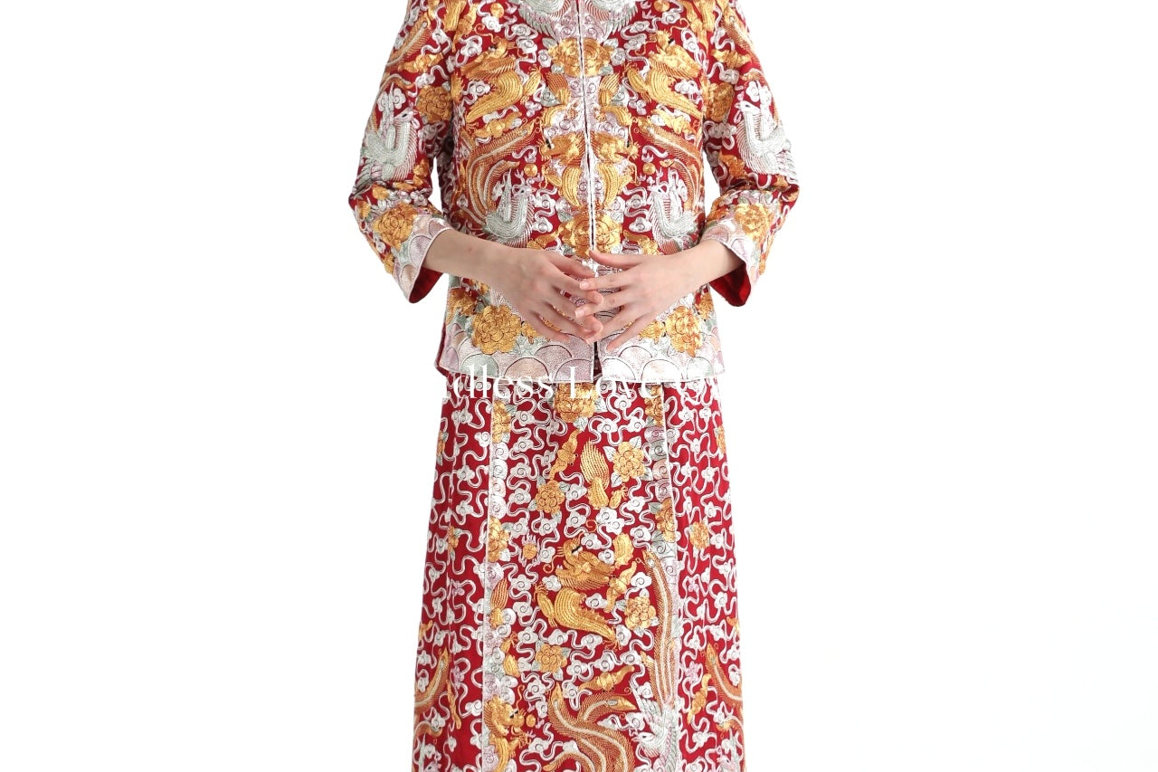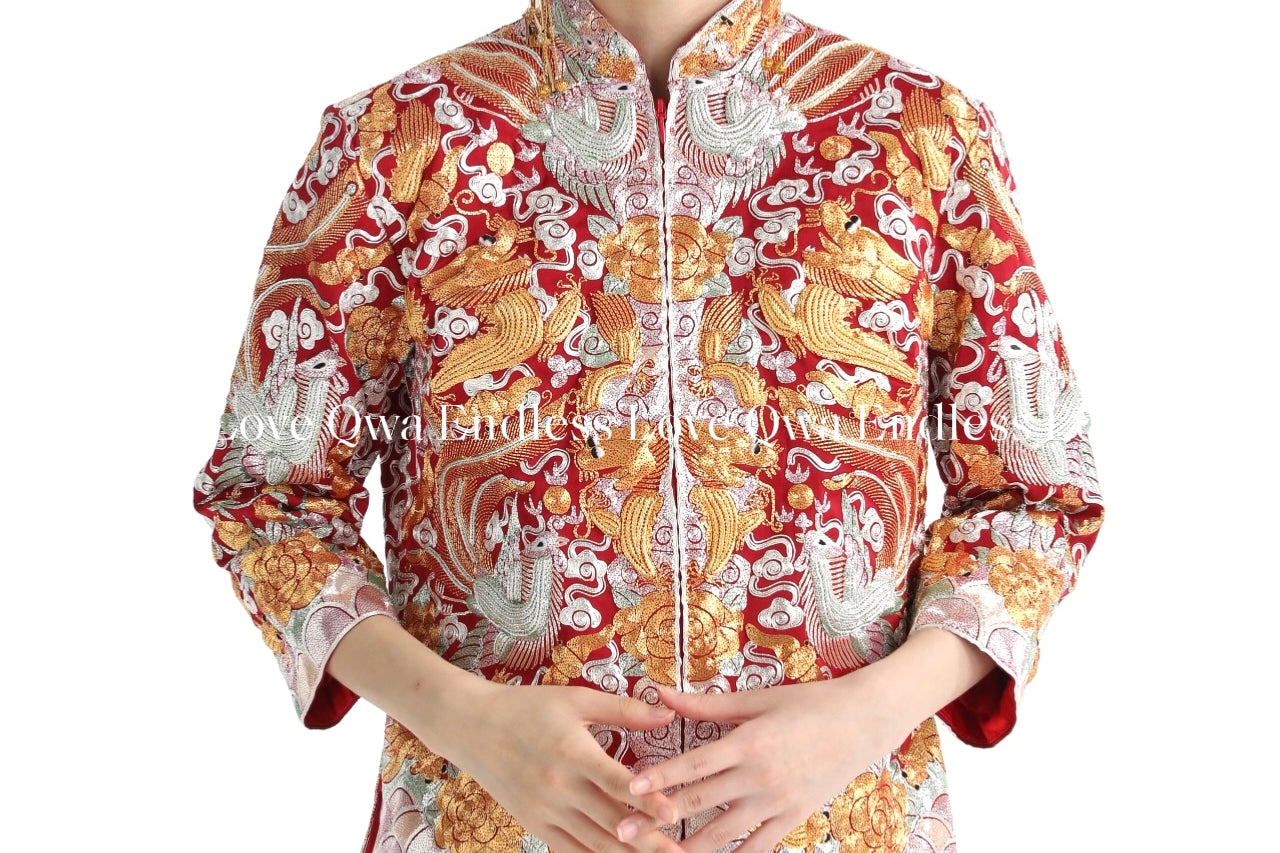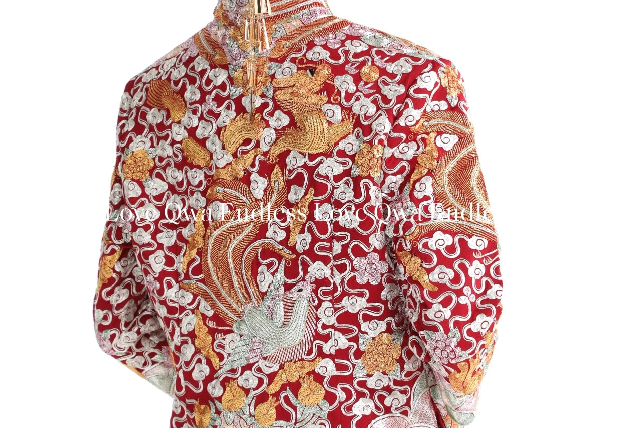 這個等級的龍鳳褂將金銀絲線和紅色的比例均衡,如果想選擇帶有中式喜慶的龍鳳褂,大五福將會是和合適的選擇。